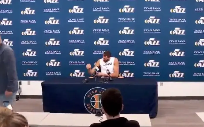 Na conferência de imprensa, Gobert tocou em todos os mirofones, mesa, etc, a gozar com o alarmismo que se anda a ter em torno do Covid-19.